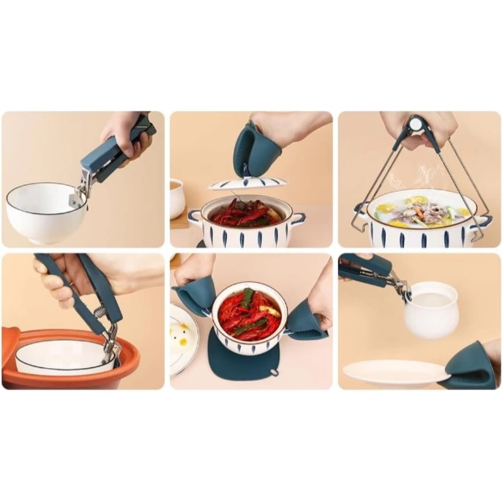 4 PARÇA YANMA ÖNLEYİCİ MUTFAK SETİ - TENCERE TABAK TUTUCU VE FIRIN ELDİVENİÜrün Özellikleri4 parça yanma önleyici mutfak seti, mutfakta güvenli ve pratik kullanım sunar. Isıya dayanıklı silikon ve paslanmaz çelik malzemeden üretilmiştir. Setin içinde bulunan tencere ve tabak tutucu sayesinde sıcak kapları kolayca kavrayabilir, fırın eldivenleri ile elinizi yüksek ısıdan koruyabilirsiniz. Kaymaz yüzeyi sayesinde elden kayma riskini azaltır ve güvenli taşıma sağlar. Geniş kullanım alanına sahip olan bu set, tabak, tencere, tava ve kase gibi çeşitli mutfak gereçlerinde rahatlıkla kullanılabilir. Şık ve ergonomik tasarımı sayesinde hem ev kullanımı hem de profesyonel mutfaklar için idealdir. Bulaşık makinesinde yıkanabilir ve uzun ömürlü yapısıyla mutfakta vazgeçilmez bir yardımcıdır.Paket İçeriği1 adet metal tencere tutucu, 1 adet metal tabak tutucu, 2 adet silikon fırın eldiveni2 adet silikon bulaşık fırçası