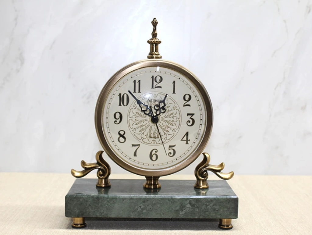 MERMER TABANLI MASAÜSTÜ SAAT Ürün ÖzellikleriMermer tabanlı masa üstü saat, klasik ve zarif tasarımıyla bulunduğu ortama şıklık katar. Yeşil mermer taban üzerine yerleştirilmiş metal gövdesi ve detaylı işlemeleriyle dekoratif bir görünüm sunar. 43x21 cm ölçüleriyle hem masa hem de raf üzerinde dikkat çekici bir aksesuar olarak kullanılabilir. Sağlam yapısı sayesinde uzun ömürlüdür ve klasik dekorasyonlarla uyum sağlayarak bulunduğu ortama nostaljik bir hava katar. Evinizde veya ofisinizde masa üstü dekorunu tamamlayacak şık bir parçadır.Paket İçeriği1 adet Mermer Tabanlı Masaüstü Saat
